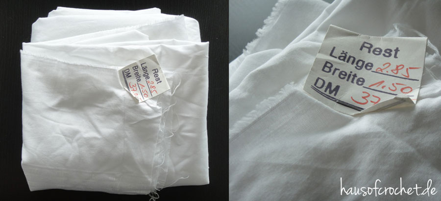 Beim Durchstöbern meines Stoffvorrats bin ich auf diesen großen, weißen Baumwollstoff gestoßen, den ich noch von meiner Oma habe. Wie alt er genau ist, weiß ich nicht, aber das Preisschild war noch in D-Mark, also muss er schon einige Jährchen auf dem Buckel haben :) Da ich den Stoff schon seit einigen Jahren habe und bisher keine Verwendung dafür finden konnte, habe ich mich entschlossen, ihn in Textilgarn zu verwandeln. Beim Durchforsten des Internets stieß ich aber meist nur auf Anleitungen für das Schneiden von Textilgarn aus alten T-Shirts. Diese Methode war aber für meinen Stoff nicht zutreffend. Also habe ich meine eigene Vorgehensweise entwickelt, die für jeden Stoff verwendet werden kann, und sich vor allem für große Stoffstücke eignet.