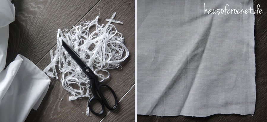 Zunächst habe ich die Webkanten des Stoffes abgeschnitten. Dies muss (genauso wie die späteren Schnitte) nicht super akkurat sein, denn auch gekauftes Textilgarn weißt oft starke Unterschiede in der Breite des Garns auf.