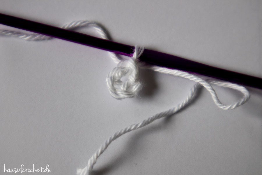 Für den Aufhänger anschließend vierzig Luftmaschen anschlagen und mit einer Kettmasche wieder in die gleiche Masche schließen. Den Faden noch einmal durch die Masche ziehen, abschneiden und alle Fäden vernähen.