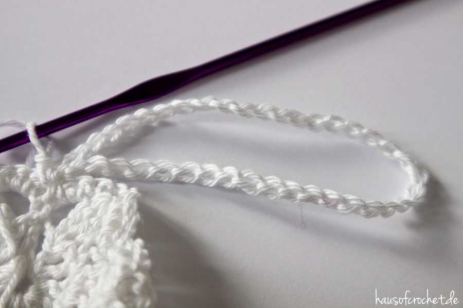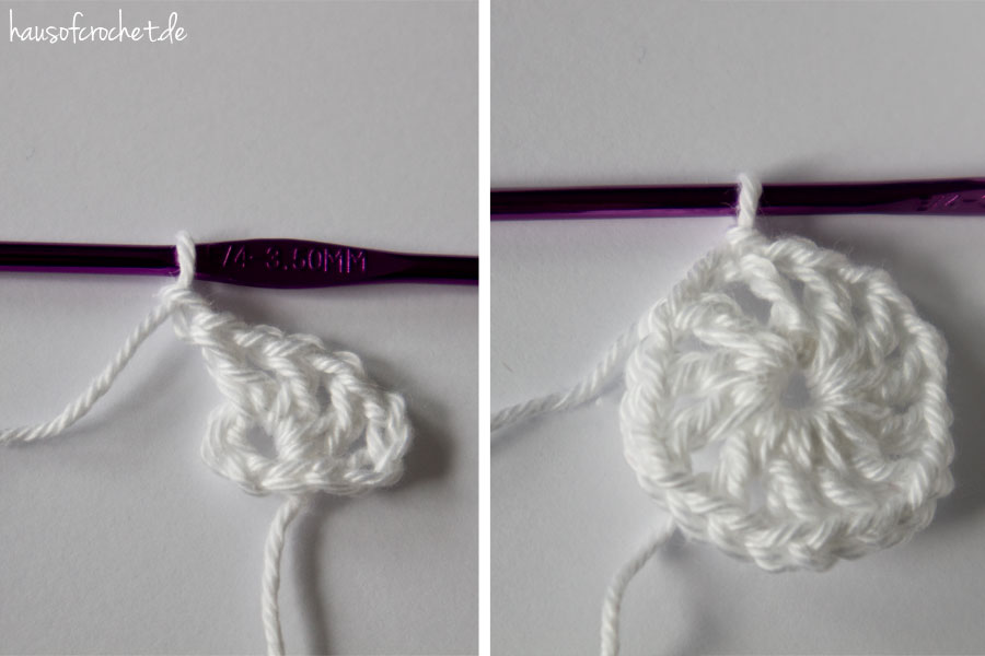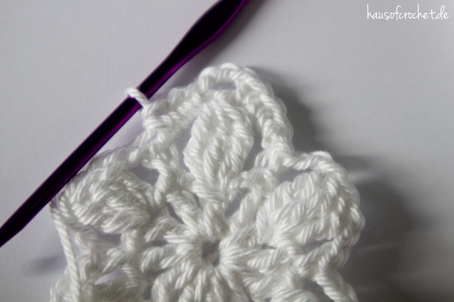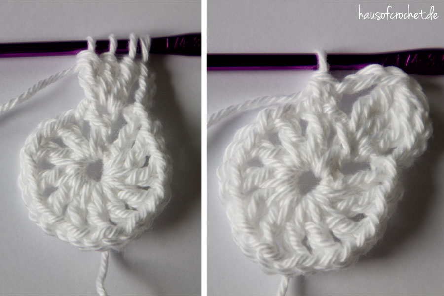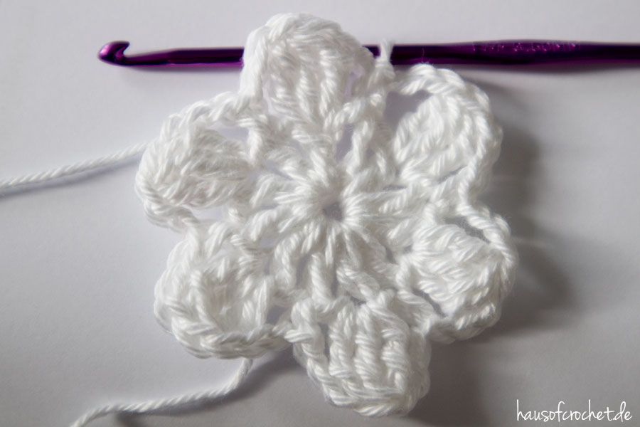 Dies noch fünf Mal wiederholen und die Runde mit einer Kettmasche schließen. Das Muster ähnelt nun einer Blüte.