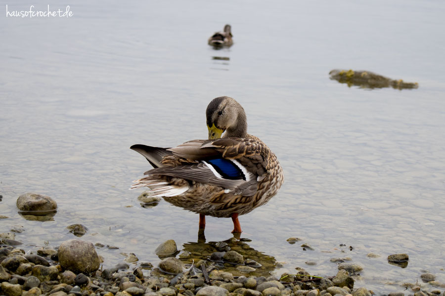 Auch Tierliebhaber kommen an der Uferpromenade auf ihre Kosten! Die Tiere am Radolfzeller Seeufer sind durch die Vielzahl an Touristen sehr an Menschen gewöhnt. So lassen sich vor allem Enten und Spatzen auch ganz aus der Nähe beobachten, wie diese Ente bei ihrer Gefiederpflege.